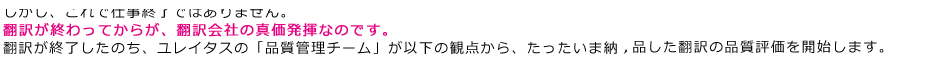 | 品質(zhì)管理チームとは? 品質(zhì)管理チームに所屬するスタッフは、直接的にお客様の原稿の英文翻訳に関わることはありません。日々、納品した翻訳原稿を精査し、品質(zhì)評価だけを?qū)熼Tに行っている獨立した監(jiān)査機関です。経験と実力のある複數(shù)名の日英のバイリンガルスタッフ、英語ネイティブスタッフから構(gòu)成されています。 |